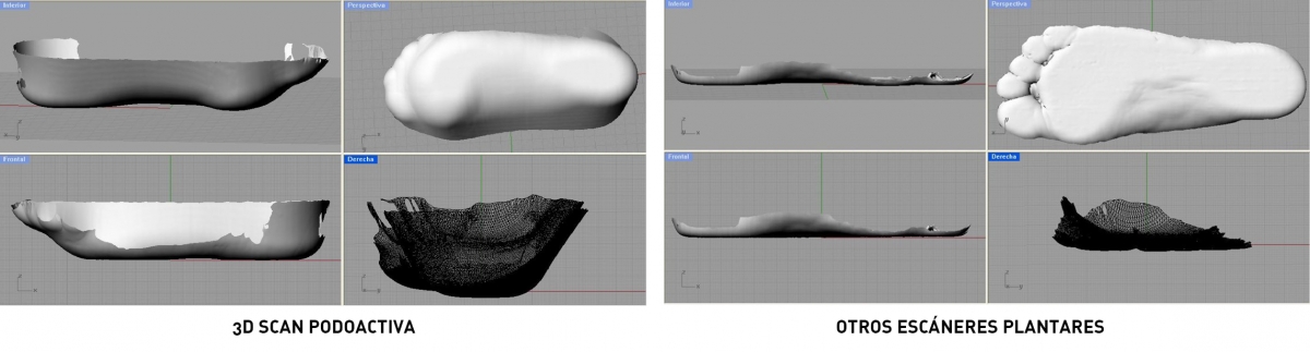 En los casos en los que el molde se obtiene directamente apoyando sobre el cristal, tanto la imagen del talón como la del antepié aparecen aplanadas y la bóveda plantar aparece sensiblemente disminuida, unos datos fundamentales para el diseño óptimo de la plantilla. En el caso del 3D Scan se recrea el pie en situación real de carga del paciente, recogiendo el tejido blando y simulando la situación dentro del zapato.