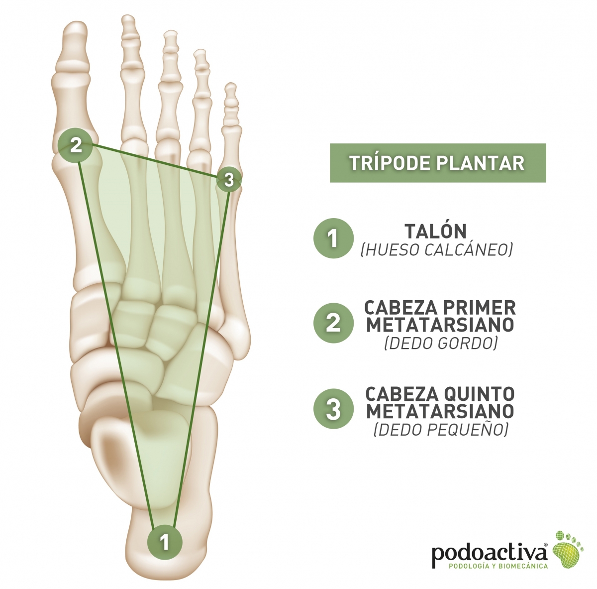 A su vez, forma parte de los tres puntos de apoyo (trípode plantar) que soportan y reparten el peso en cada paso. Estos tres puntos de apoyo son el talón, la cabeza del primer metatarsiano (dedo gordo) y la cabeza del quinto metatarsiano (dedo pequeño).