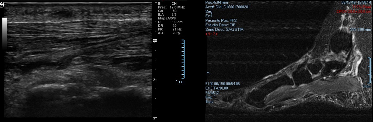 En general se pueden diagnosticar mediante la exploración clínica y una correcta anamnesis. A su vez nos apoyaremos en ecografías o RMN para visualizar la masa fusiforme, delimitar el grosor y diferenciar estructuras afectadas. A nivel de la zona dolorosa se puede apreciar una formación fusiforme de 15 mm hipoecogénica adyacente a la fascia plantar