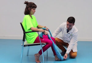 El segundo ejercicio consiste en un estiramiento como tal de las estructuras que influyen en la tensión acumulada en la planta del pie (gemelos y sóleo). Realizaremos el estiramiento sentados con la ayuda de una simple toalla o banda elástica colocándola bajo la superficie del antepié y sujetando los extremos con nuestras manos. Buscaremos realizar un movimiento de flexión en el que se acerque la punta del pie a la pierna, manteniendo la rodilla estirada.