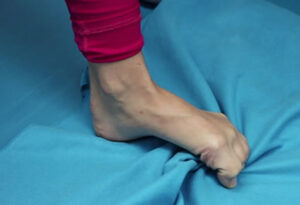 El tercer y último ejercicio que recomendamos, es un fortalecimiento de las estructuras propias del pie (musculatura intrínseca). Por lo tanto, la finalidad es conseguir aumentar el grado de resistencia de las estructuras ejercitadas para que contribuyan al soporte del arco plantar. Se realiza con una toalla extendida sobre el suelo, la cual tendremos que intentar agarrar y/o arrastrar hacia nosotros con los dedos del pie.