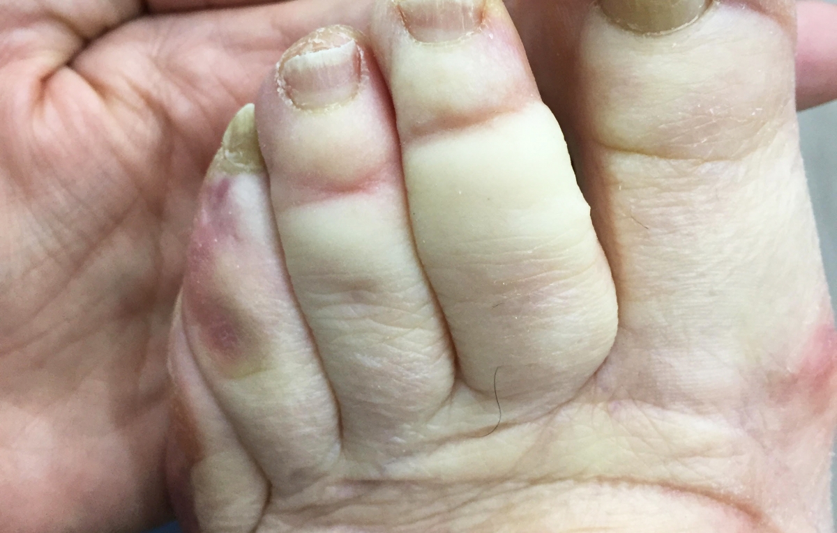 La apariencia es una piel blanquecina y en las zonas distales rojas, la temperatura dérmica es fría y la sensibilidad está muy disminuida.