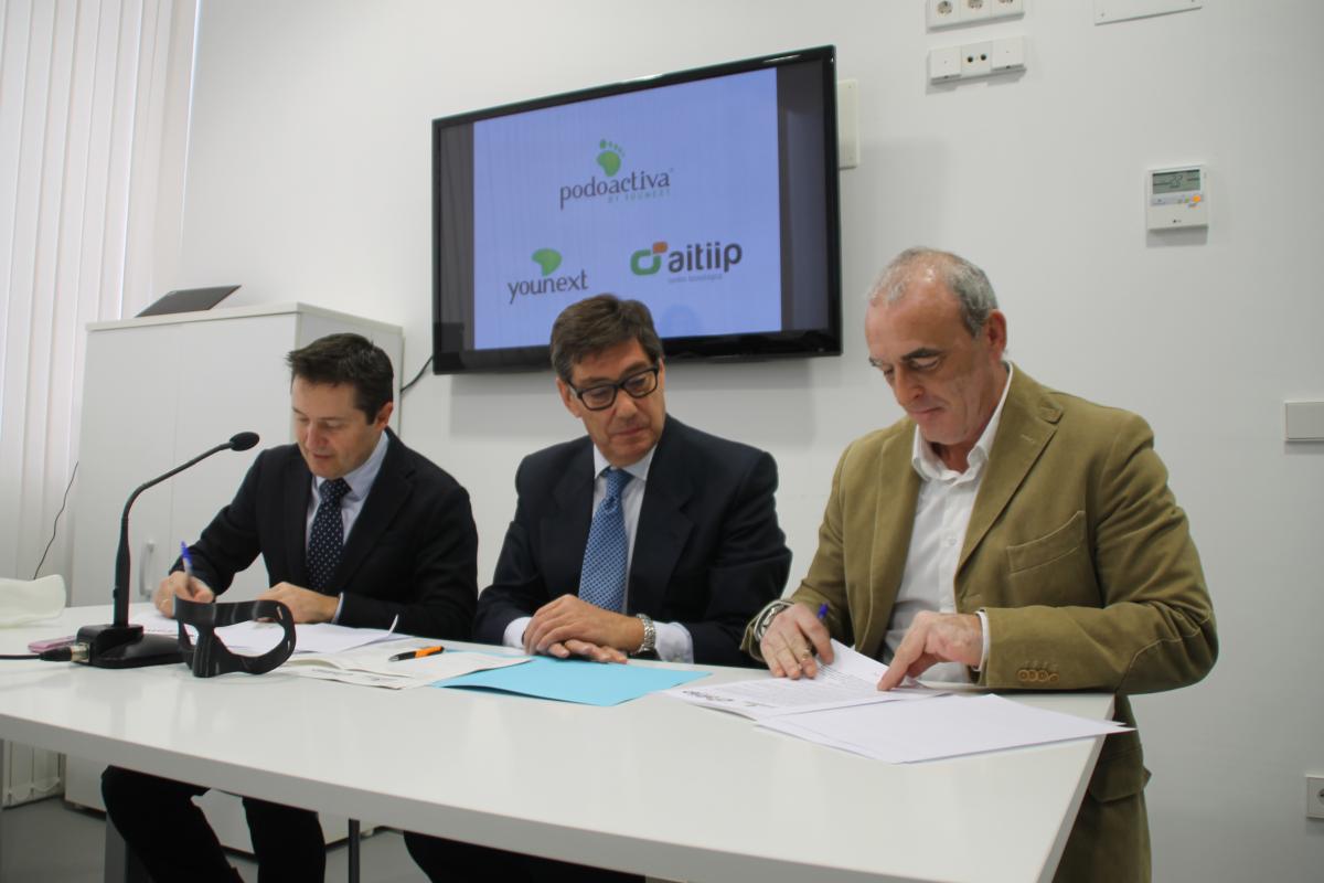 19 Ene 2015Podoactiva lanza la marca Younext para diseñar y fabricar nuevos tratamientos personalizados. Las empresas Podoactiva y AITIIP Centro Tecnológico han alcanzado un acuerdo para colaborar en materia de investigación, desarrollo e innovación tecnológica en el campo de la salud y el deporte. La firma ha tenido lugar en la sede de Podoactiva ubicada en el Parque Tecnológico Walqa, en presencia del consejero de Industria e Innovación y presidente del complejo tecnológico altoaragonés, Arturo Aliaga. Ha corrido a cargo del director general de Podoactiva, Víctor Alfaro, y del director gerente de AITIIP, Víctor Rivera.