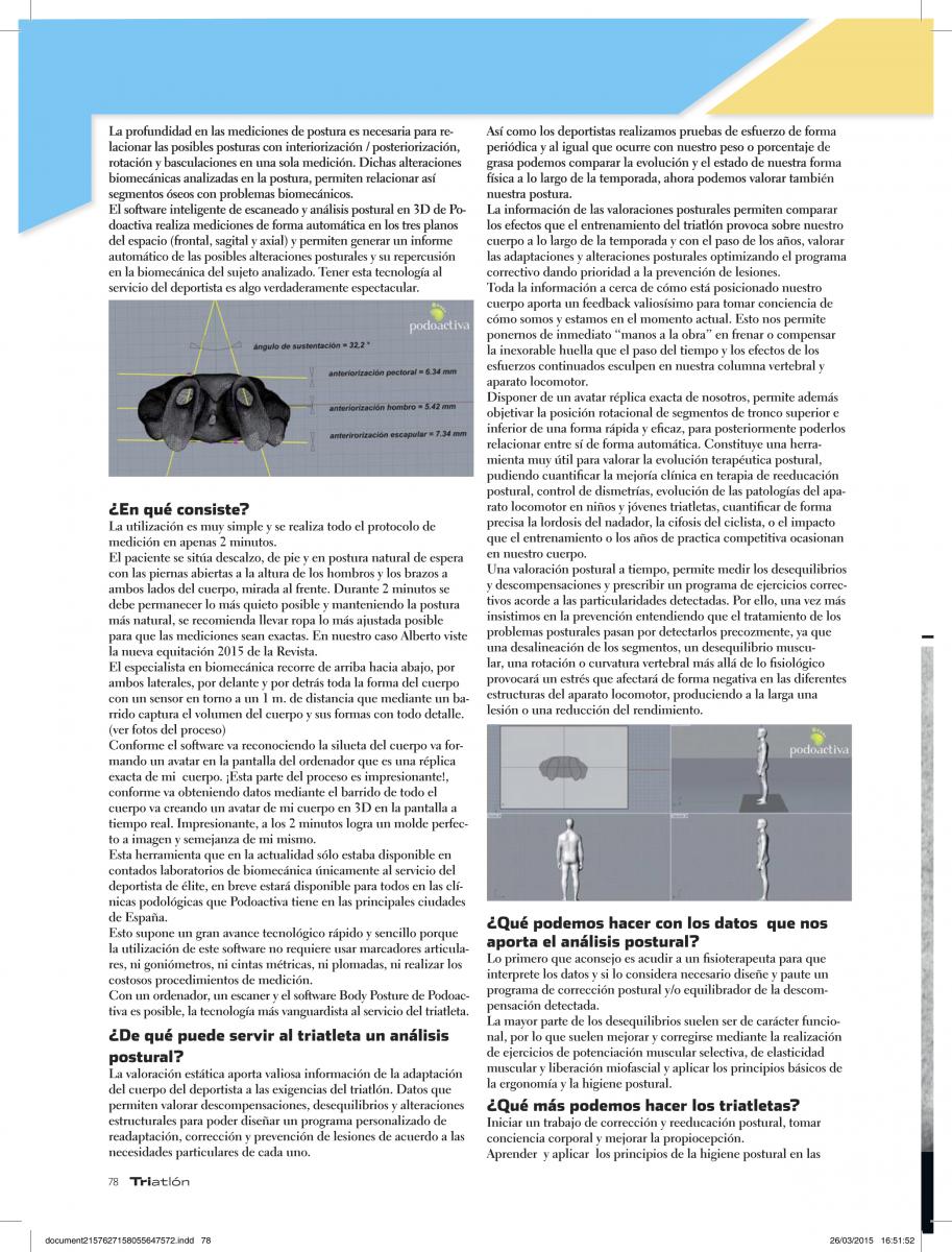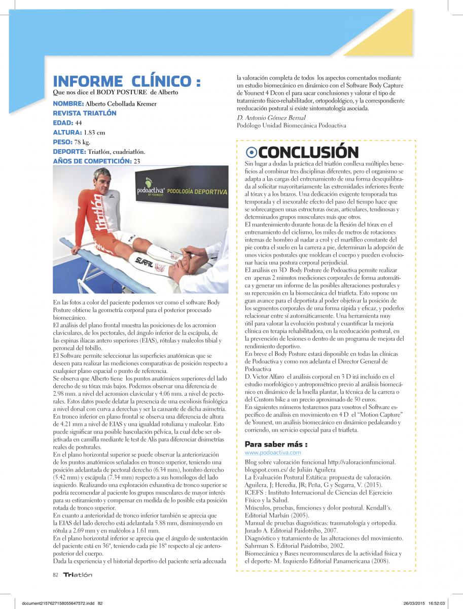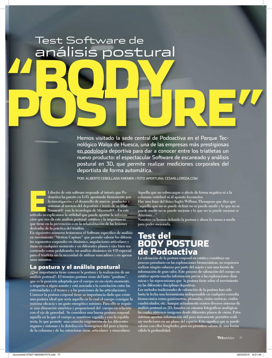 22 Abr 2015Aquí os dejamos el artículo completo que el triatleta Alberto Cebollada ha escrito para la revista Triatlón del grupo Motorpress hablando sobre nuestro sistema de análisis postural Podoactiva Body Posture. Gracias Alberto y gracias a la revista Triatlón por el interés que siempre demuestran por nuestras innovaciones.