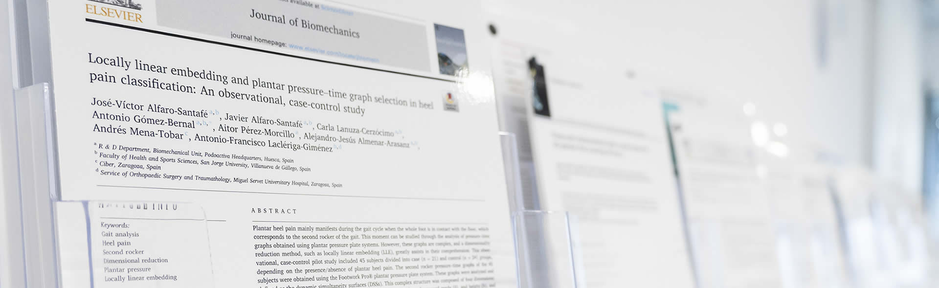 - Alfaro-Santafé JV, Alfaro-Santafé J, Lanuza-Cerzócimo C, Gómez-Bernal A, Pérez-Morcillo A, Almenar-Arasanz AJ, Mena-Tobar A, Laclériga-Giménez AF. Locally linear embedding and plantar pressure-time graph selection in heel pain classification: An observational, case-control study. J Biomech. 2021;128:110784. Disponible en: Aquí.
